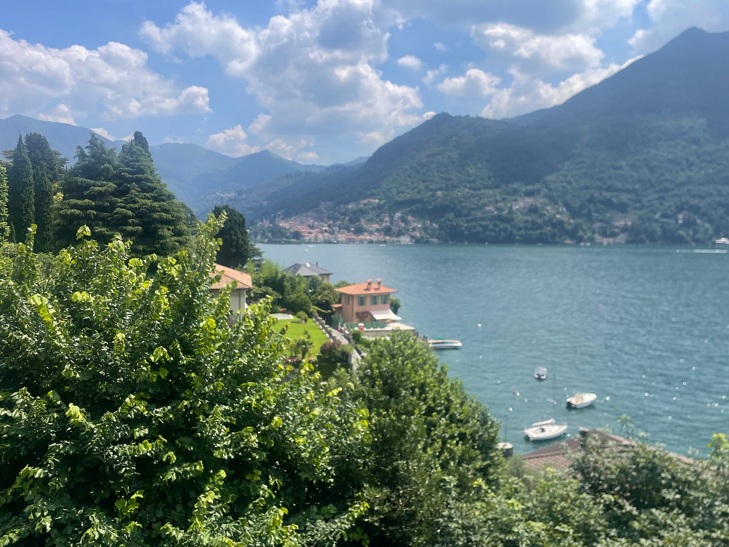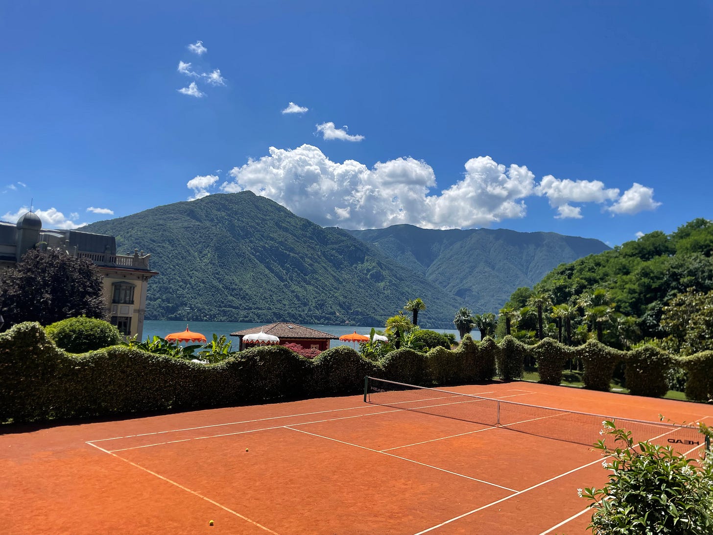 Como comes to you like a whisper. The air mild, warm, and fragrant. Grand Hotel Tremezzo, onomatopoetically correct, an abiding sense of peace in a valley. The point where the lake tapers and the mountains climb at sharp angles. There are so many ice cubes in spritz chalices that it becomes part of the scenery. Prosecco sizzling across a cold glass of Aperol. Tennis in the late afternoon. The burnt Sienna of the court, the iridescent play of green and gold in the distance. Graceful trees swaying. Arched walks through the hedges. A smell so summer-lush it surrounds the body, swirling like a meteorologic condition.